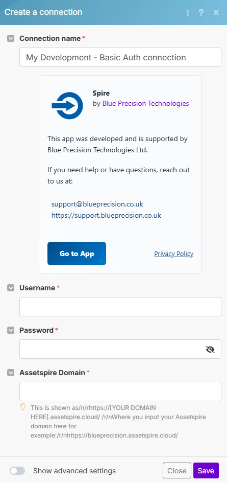 BPT App License Key: This is a key provide by BPT to authorise access to the Make AppsIf you intend to use multiple connections for spire. Naming the connections different names will make choosing the correct connection easier.